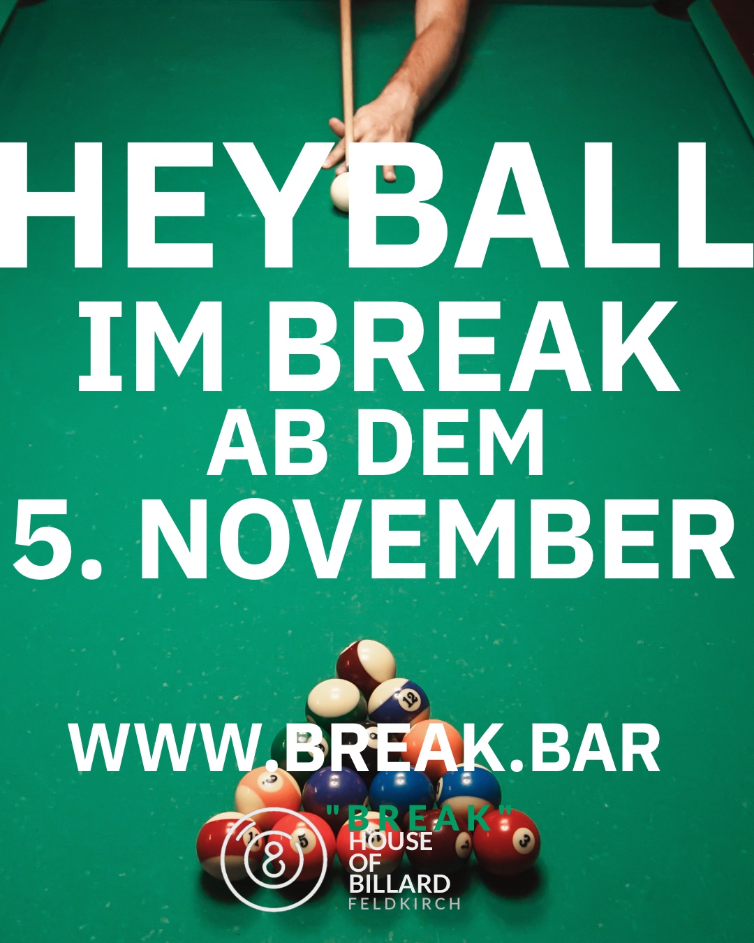 Wir freuen uns euch ab nächstem Mittwoch (5. November 2025) etwas ganz neues präsentieren zu dürfen. Der neue Billard Trend “Heyball”. Ab dem. 5. November auch im Break.